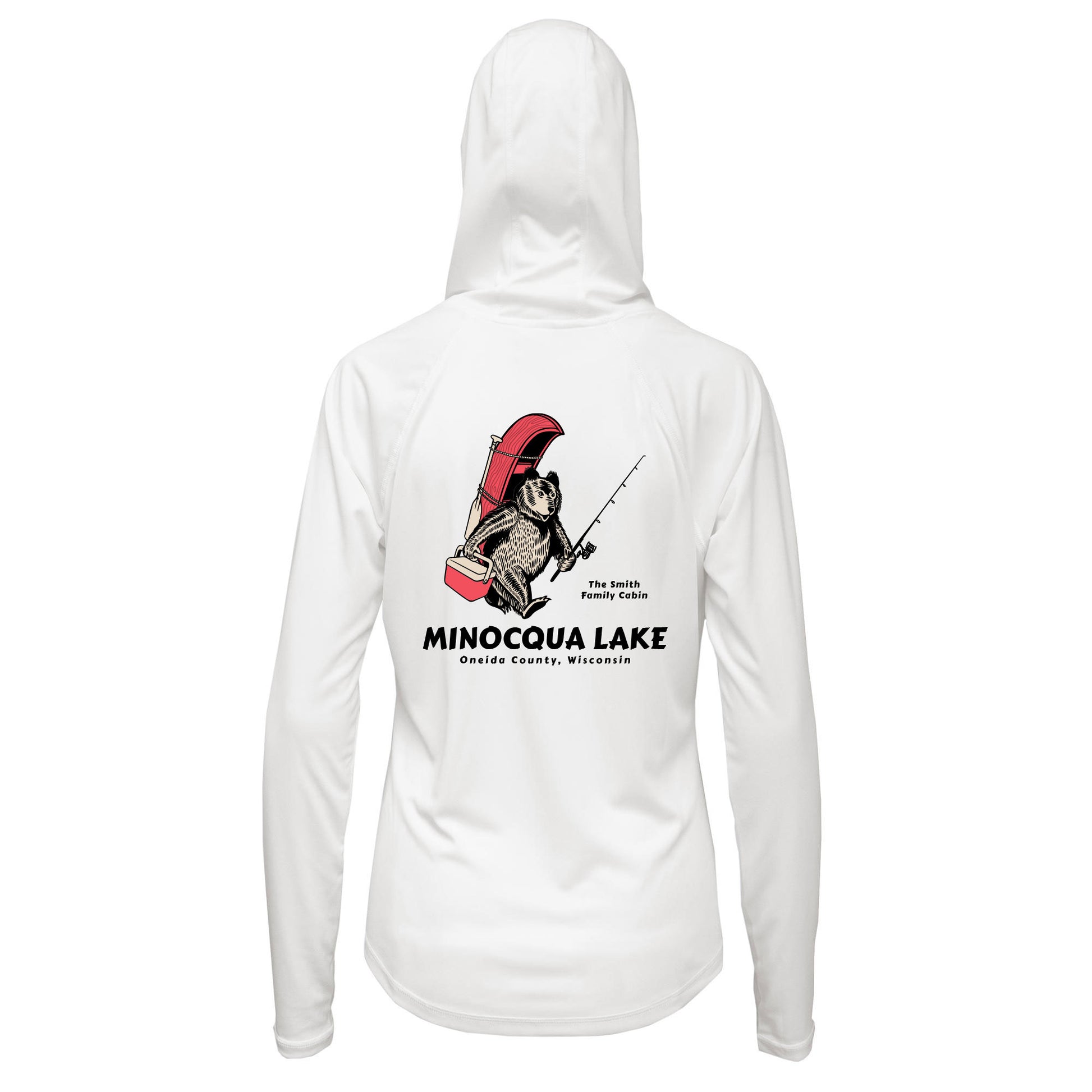 This custom UPF50+ adventure shirt features a fun bear, fishing pole, and canoe artwork, with fully editable text to match your favorite family getaway. Whether it’s your lake house name, cabin nickname, or reunion crew, your story is the one we're printing.