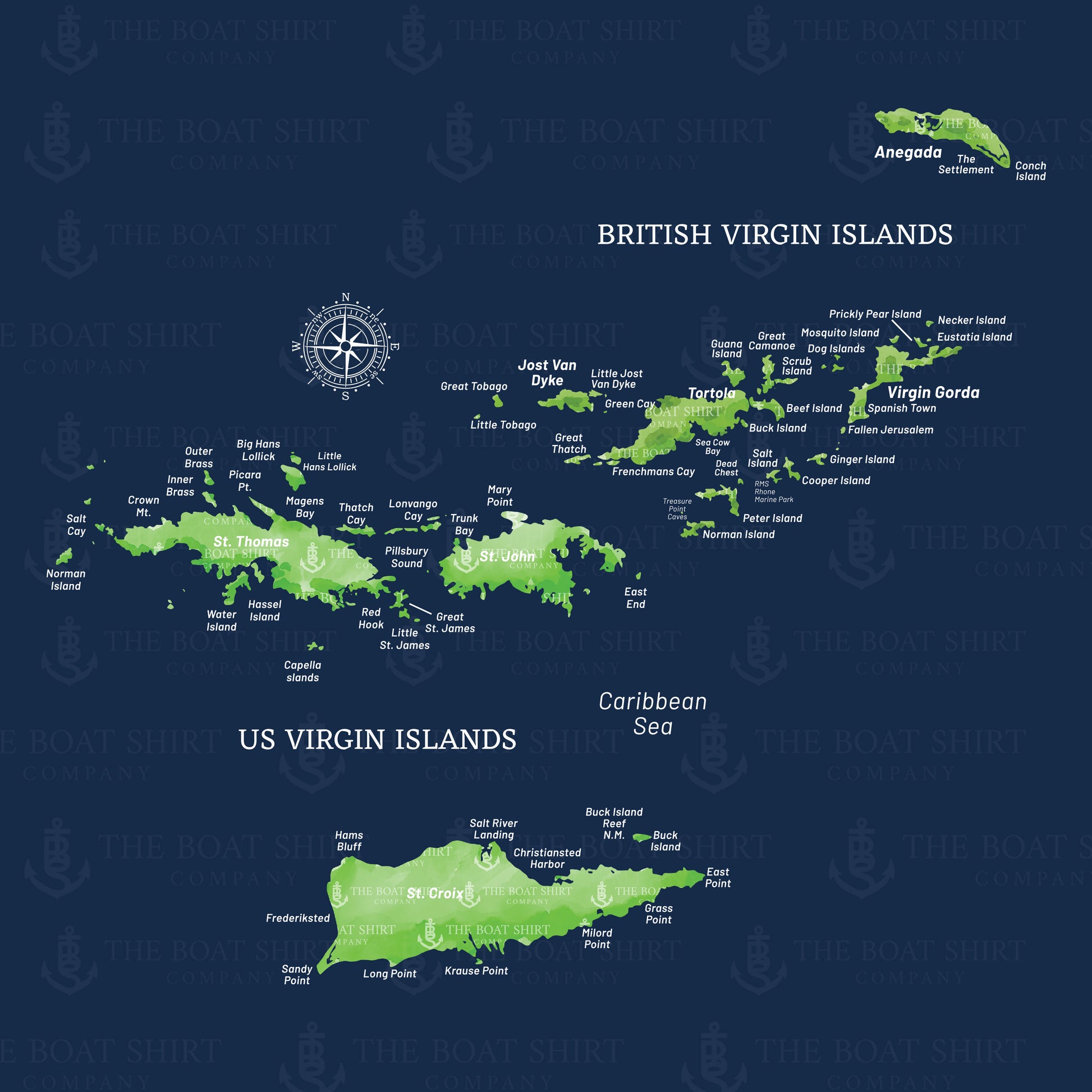 This navy UPF50+ sun shirt features a clean, map-style graphic of the USVI and BVI—perfect for commemorating a family sailing trip, boat charter, or island-hopping vacation. Whether you cruised through St. Thomas, snorkeled around St. John, or anchored in White Bay, this shirt captures the spirit of the journey.